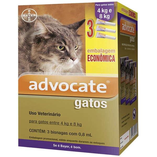 A combinação poderosa dos ingredientes de Advocate protege seu animal por dentro e por fora. Com seu modo de ação por contato, ou seja, sem necessidade de os parasitas picarem o animal antes de morrer, o Advocate mata as pulgas de forma rápida; reduzindo o risco de picadas, o que significa mais bem-estar para o seu pet. Além disso, o produto auxilia no controle ambiental das pulgas, pois seu princípio ativo, a imidacloprida, é eliminado naturalmente conforme o seu gato solta pelos, matando as larvas de pulgas no ambiente e interrompendo o ciclo de vida do parasita.