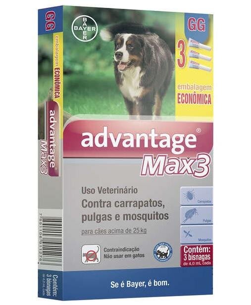 Carrapatos: Advantage Max3 elimina os carrapatos presentes no cão entre 24 e 48 horas após o tratamento e continua controlando novas infestações por, pelo menos, 4 semanas. Os órgãos sensoriais e as terminações nervosas do carrapato quando entram em contato com o animal tratado apresentam um estado de hiperexcitação. O carrapato assim afetado movimenta-se de forma brusca e descoordenada, logo morrendo pela ação de Advantage Max3. Pulgas: O produto elimina as pulgas.