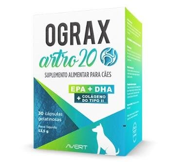 Ograx Artro 20 é um suplemento alimentar composto por nutrientes essenciais às articulações. É indicado para cães que necessitem do aporte desses nutrientes.